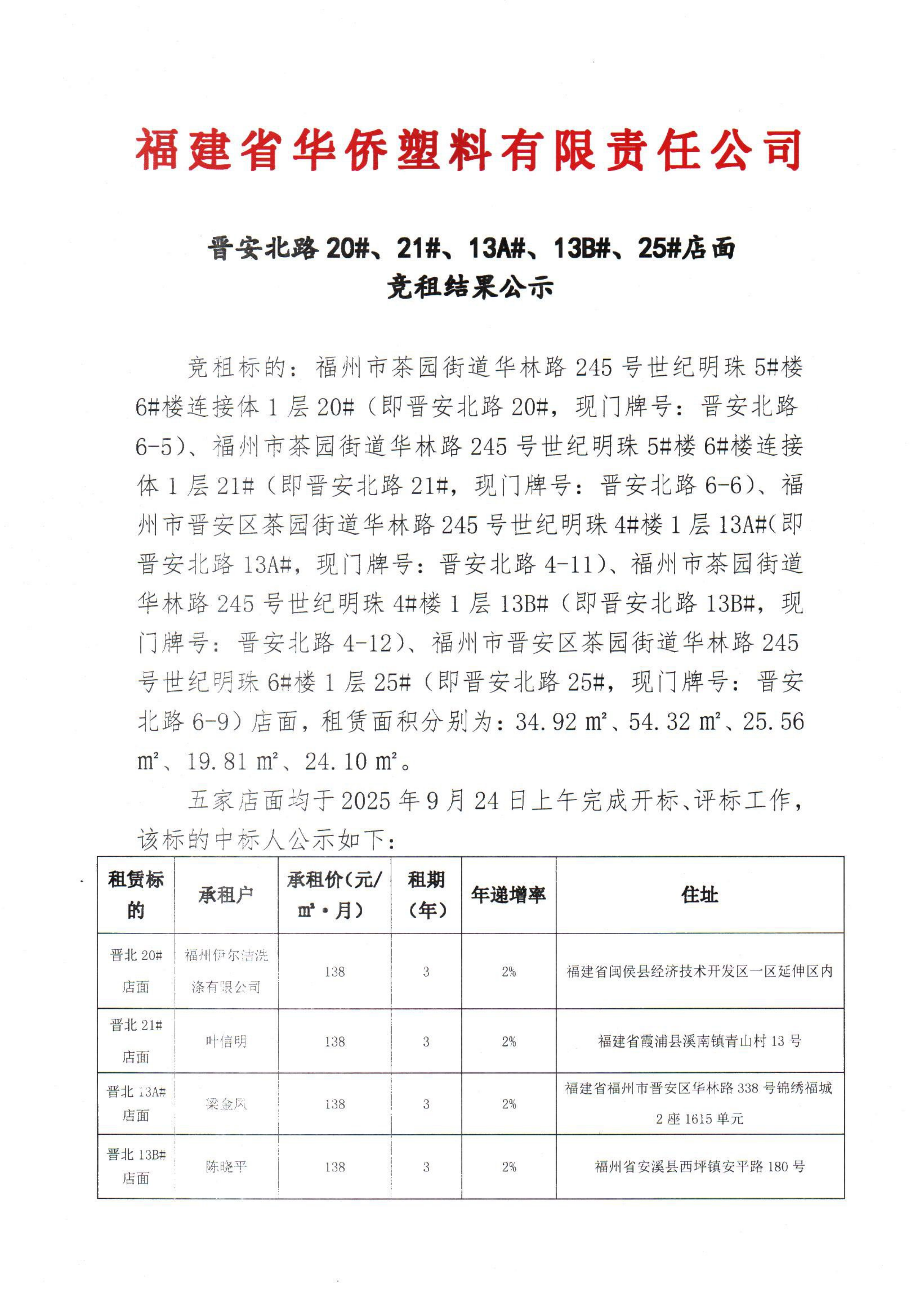 晉安北路20#、21#、13A#、13B#、25#店面竟租結果公示